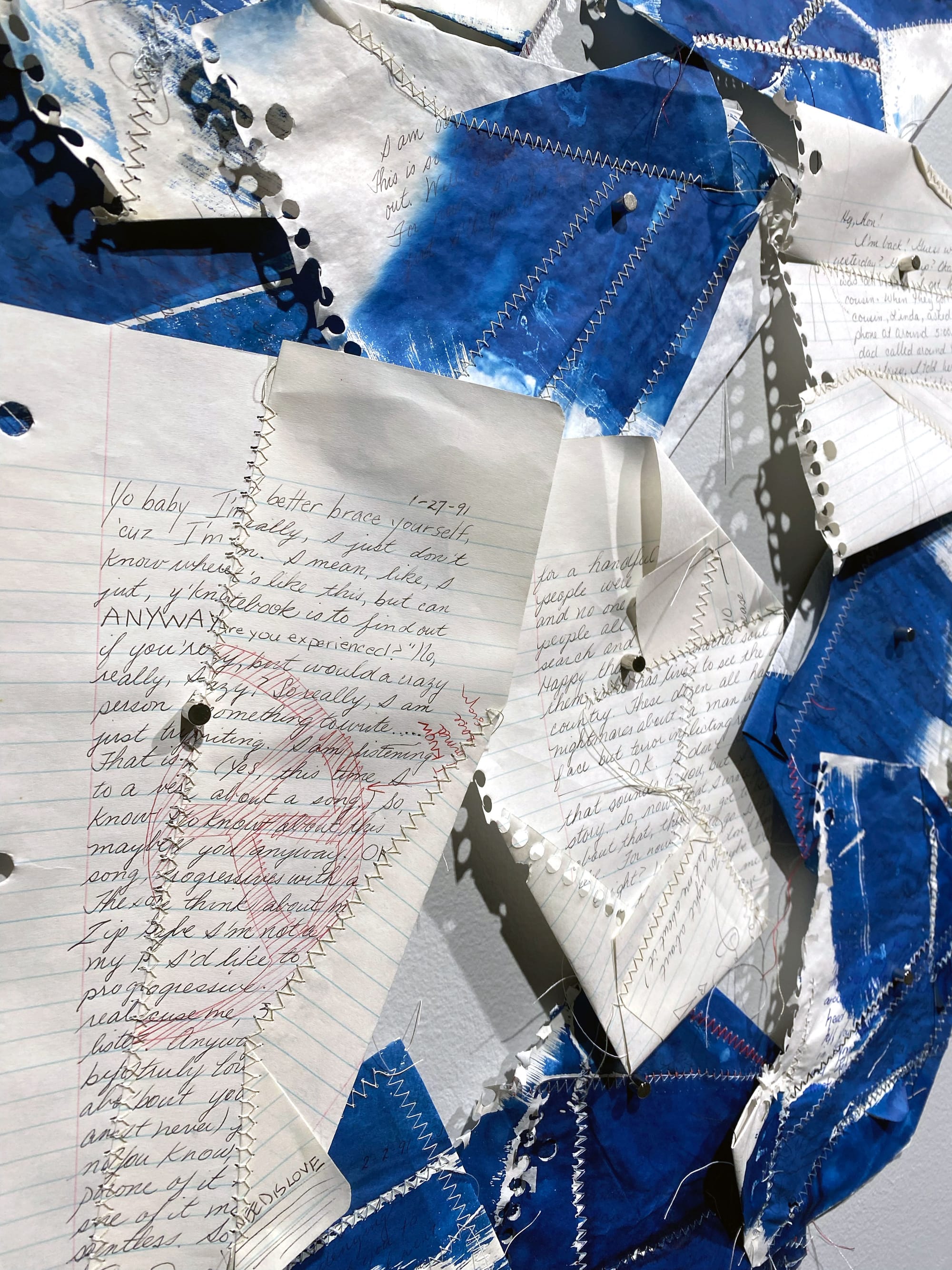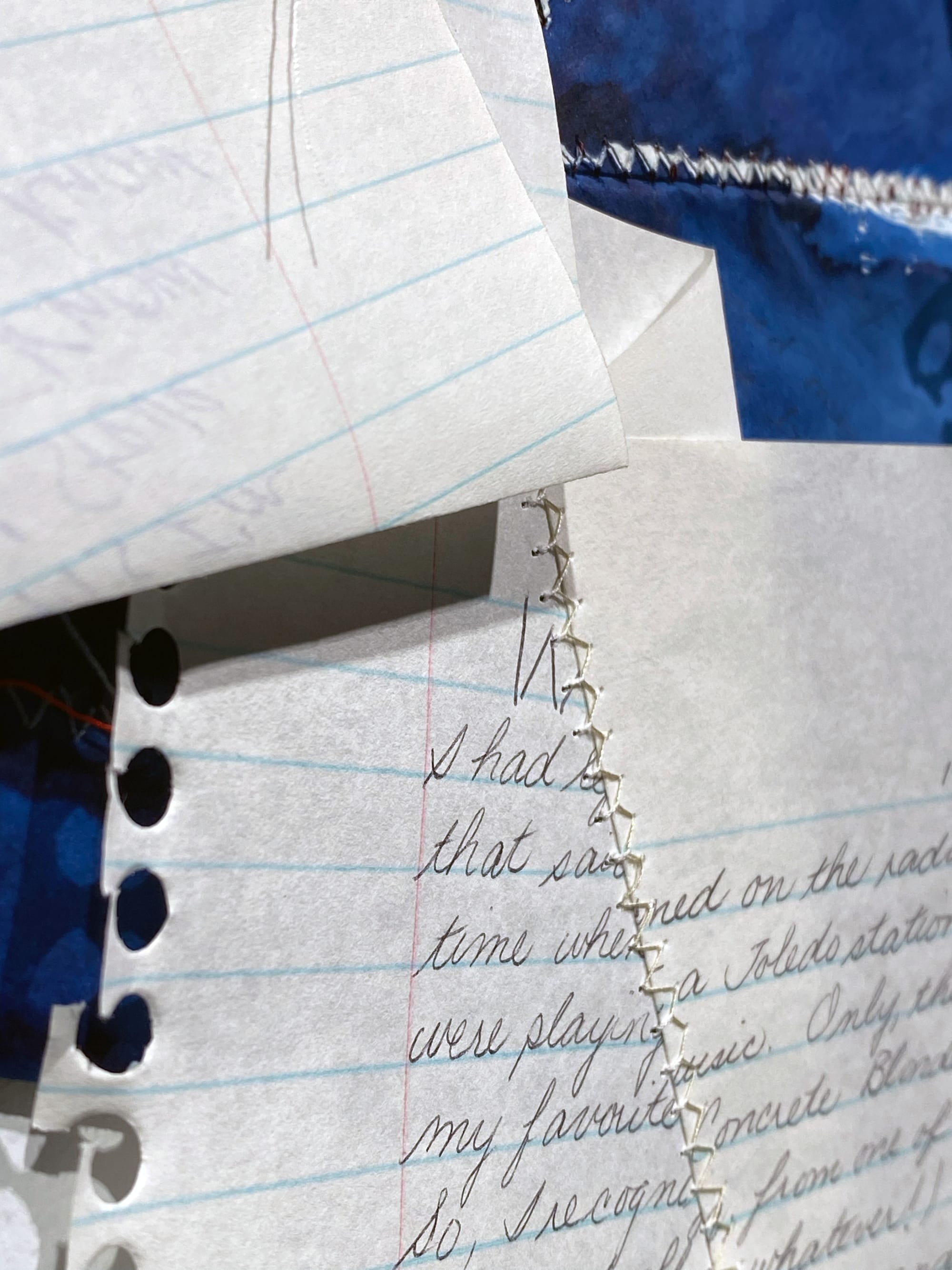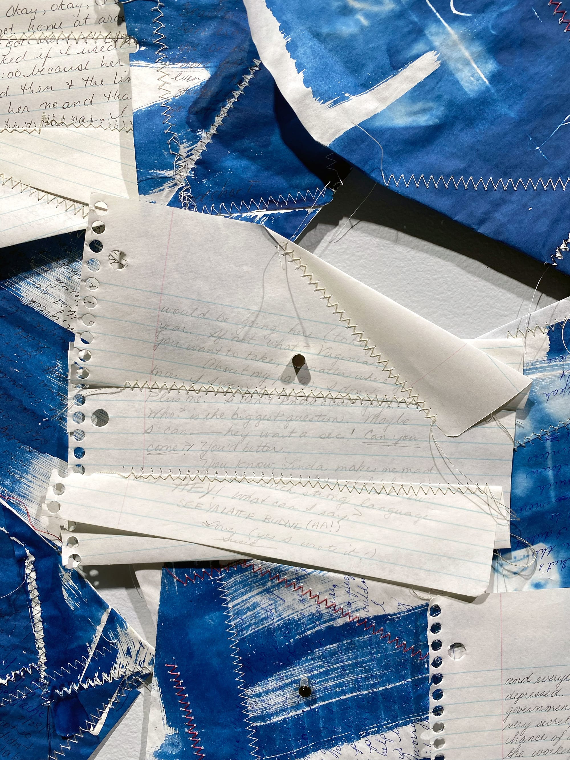 After only a few months, she moved away, leaving the notebook with me. Now, years later, I returned to those pages. Individual messages from the notebook are folded and stitched together, creating layered forms where the messages are mostly closed off from view. The stitching holds the letters shut, preserving the privacy of what we shared. Only fragments of the writing remain visible, glimpses of a conversation that was always meant only for us.