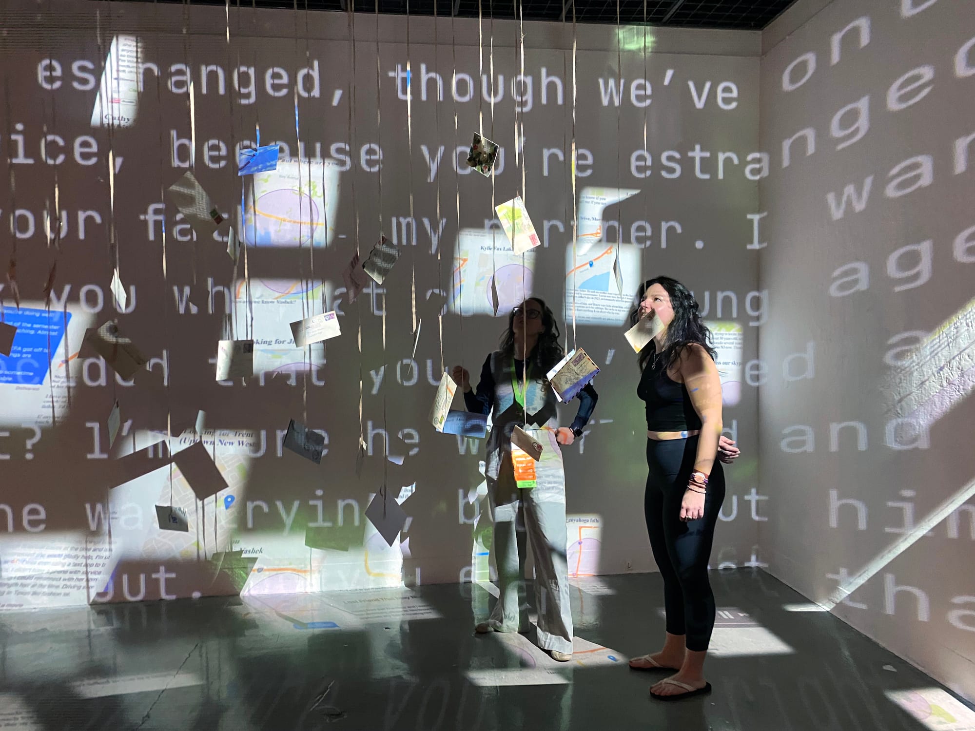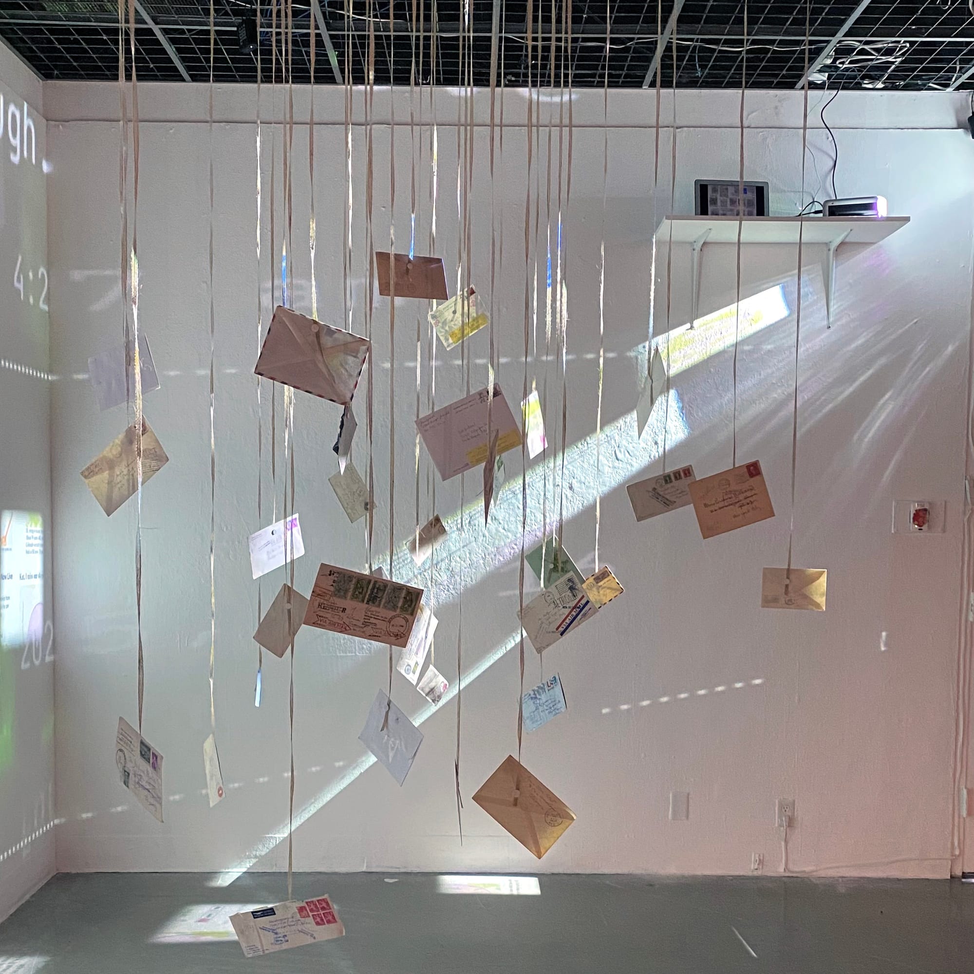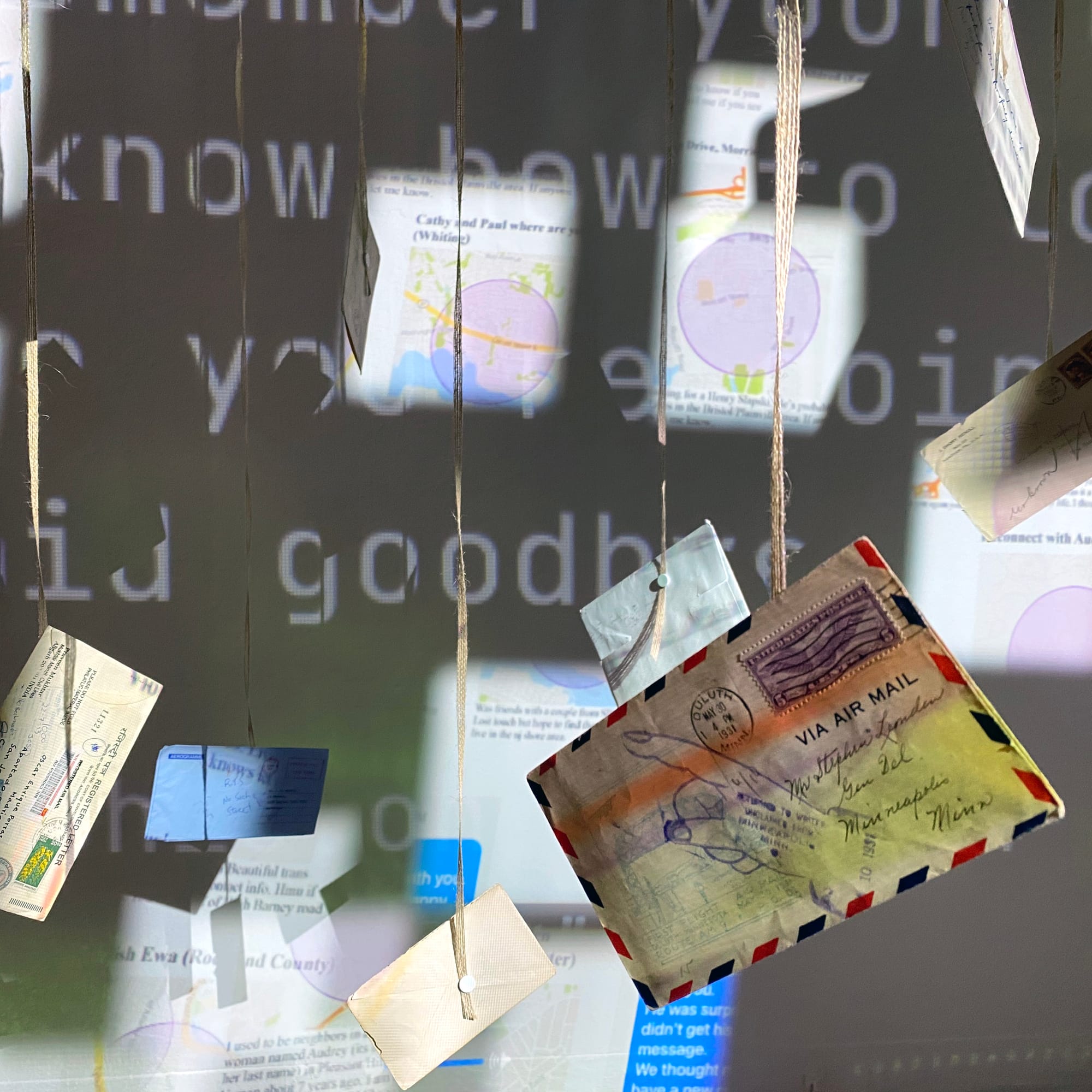 Waiting for Your Response layers communication attempts from the past 150 years—from 19th-century letters to 1980s answering machine messages to present-day texts. The installation occupies a blacked-out or dimly lit space, illuminated only by light from two projectors. Viewers engage with the object portion of the installation by moving around an organic cluster of “return to sender” letters suspended from the ceiling. A time-delayed and decaying live audio stream of sound from the installation overlays voicemail clips from multiple hidden speakers. The viewers’ physical presence disrupts the projections of a fragmented grid of dissolving digital communications (online posts, text messages) across the walls, floor, and ceiling.