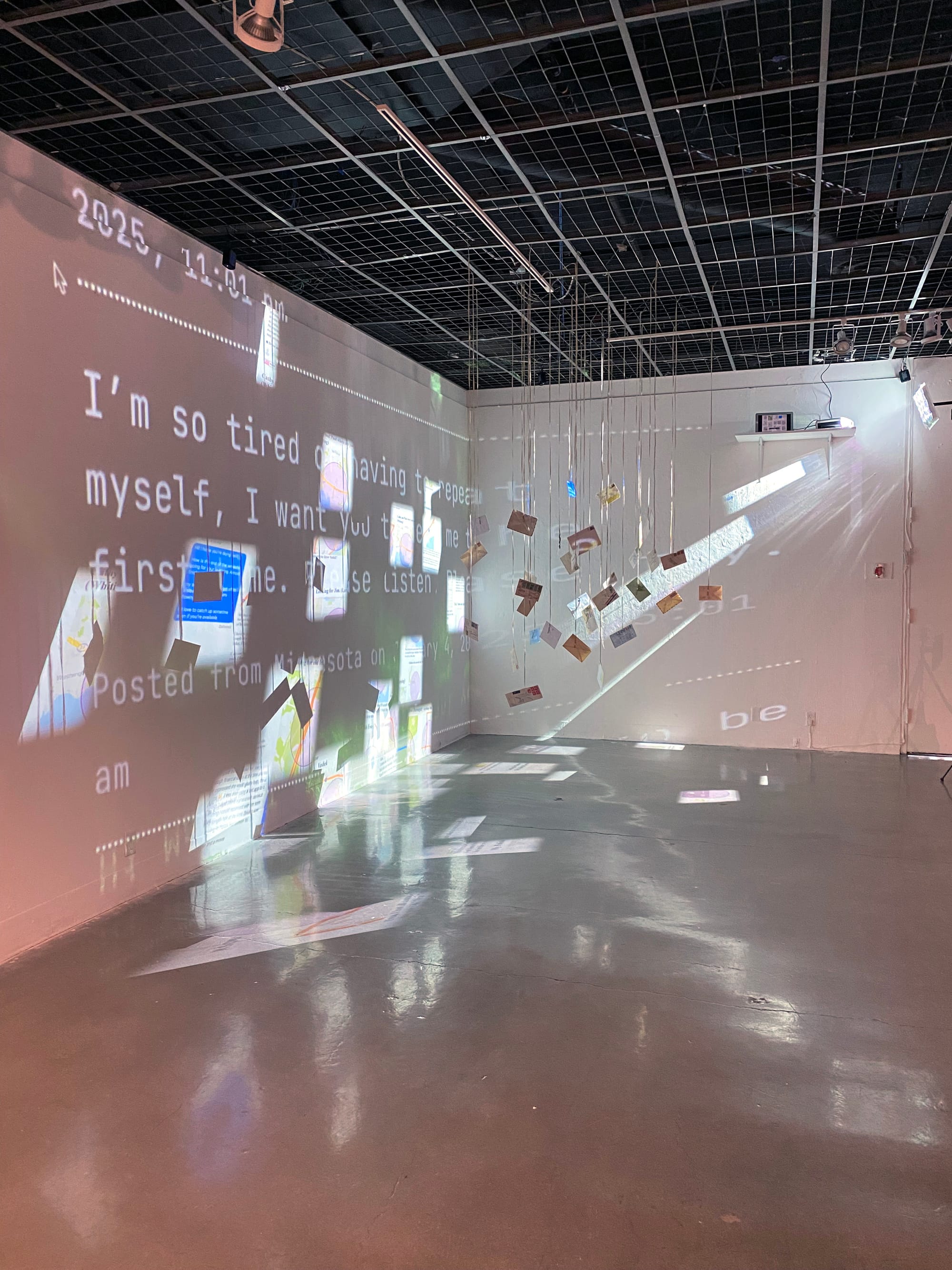 Media installation: envelopes, ribbon, magnets, video projection of digital screenshots, mirrors, looped website posts, looped voicemail recordings, live audio