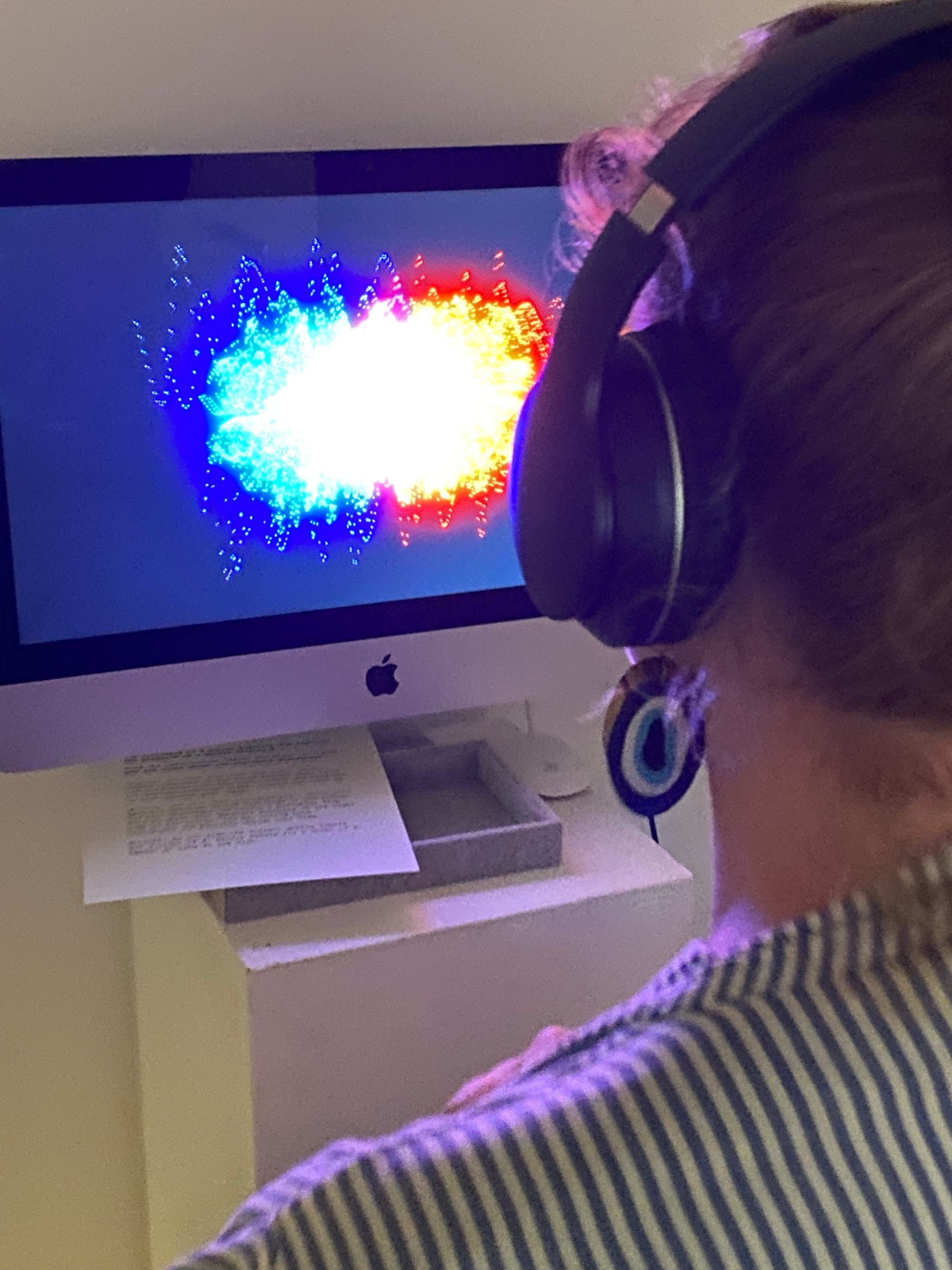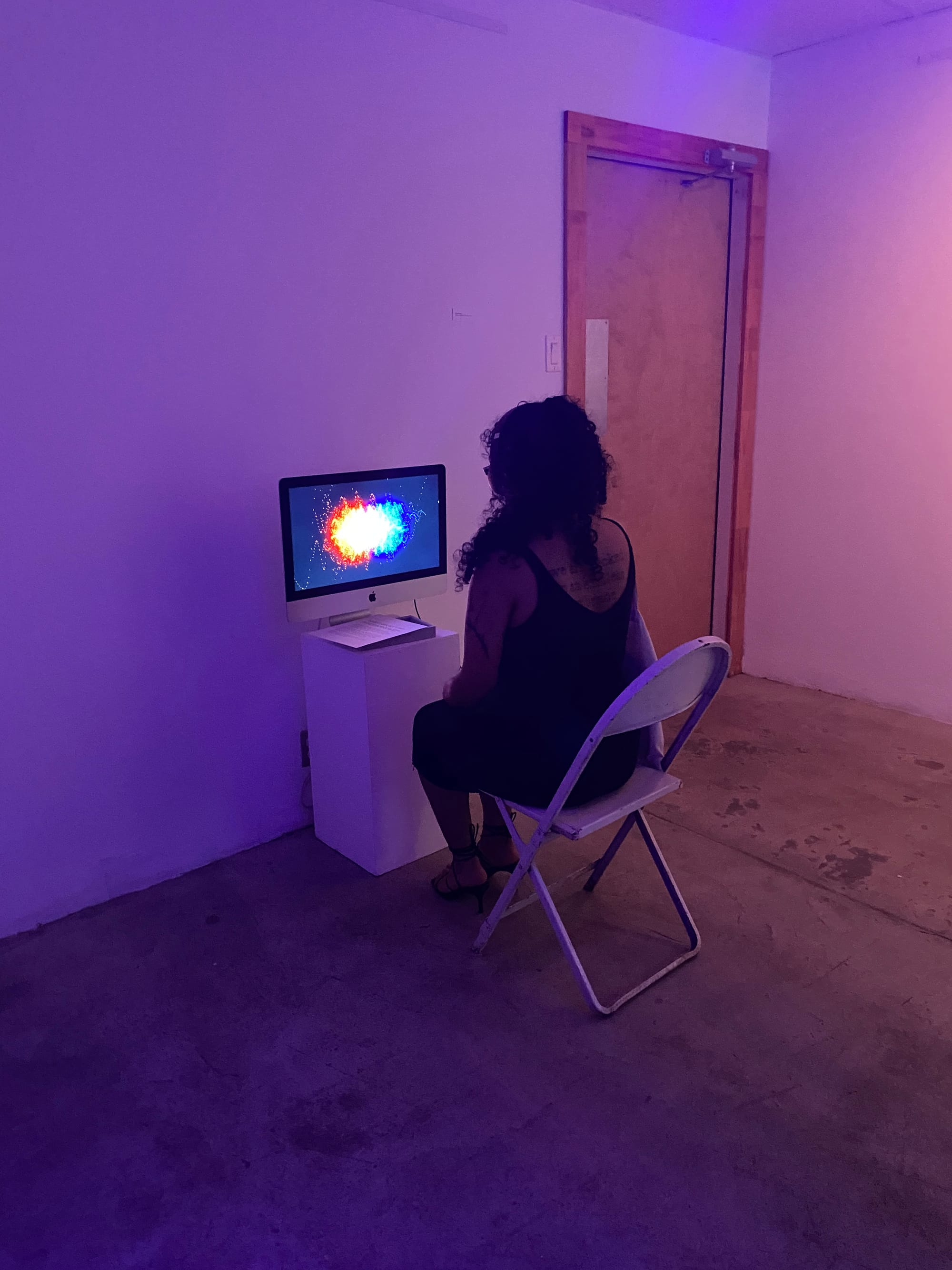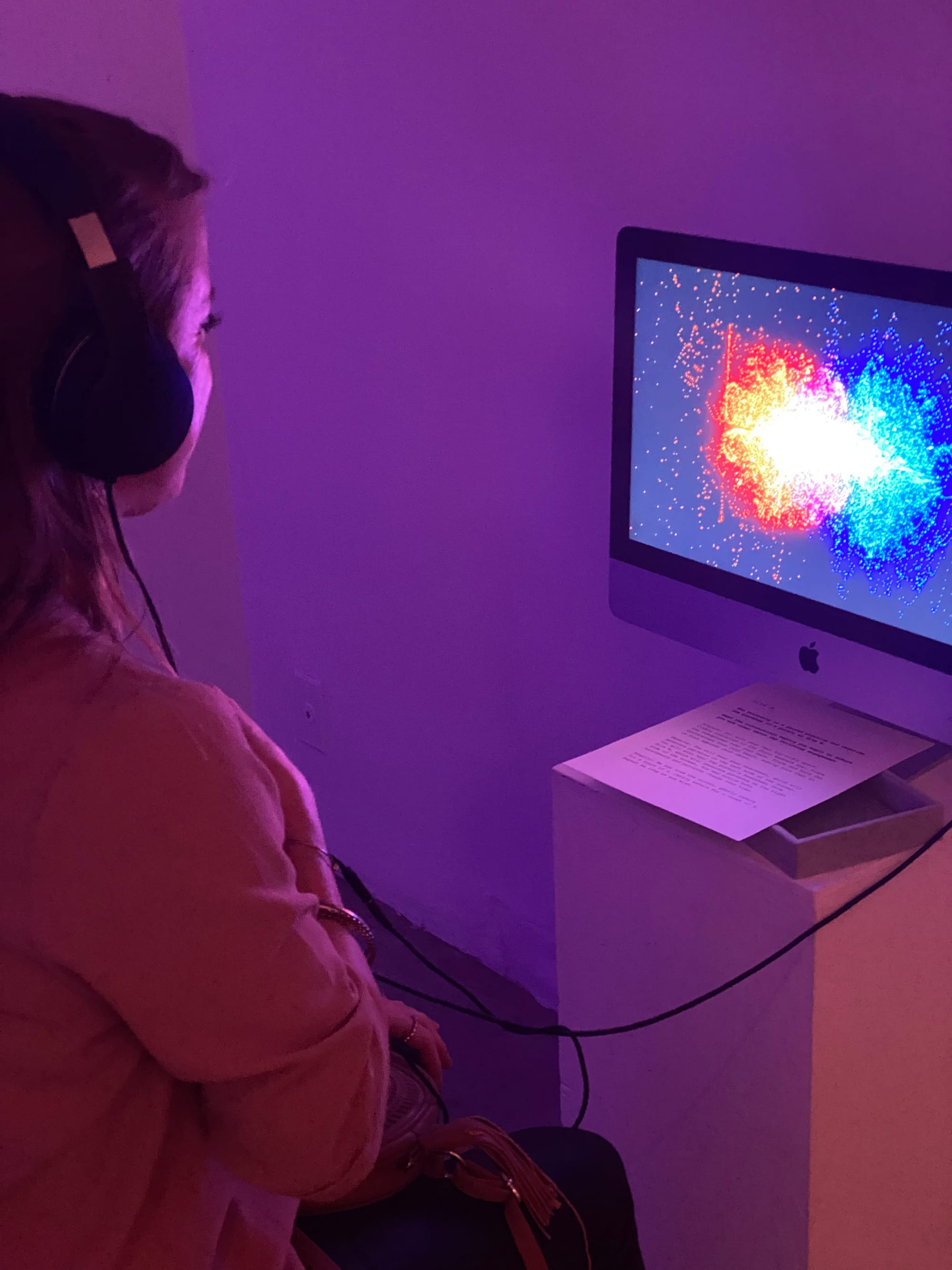 What We Share That We Cannot See is an interactive media installation incorporating participants’ live heartbeats. Two technology stations, each equipped with a computer, digital stethoscope, headphones, and custom software I designed, are positioned within stand-alone alcoves adorned with velvet curtains and soft stools. The installation enables two participants to create an interactive feedback loop using the sounds of their bodies.