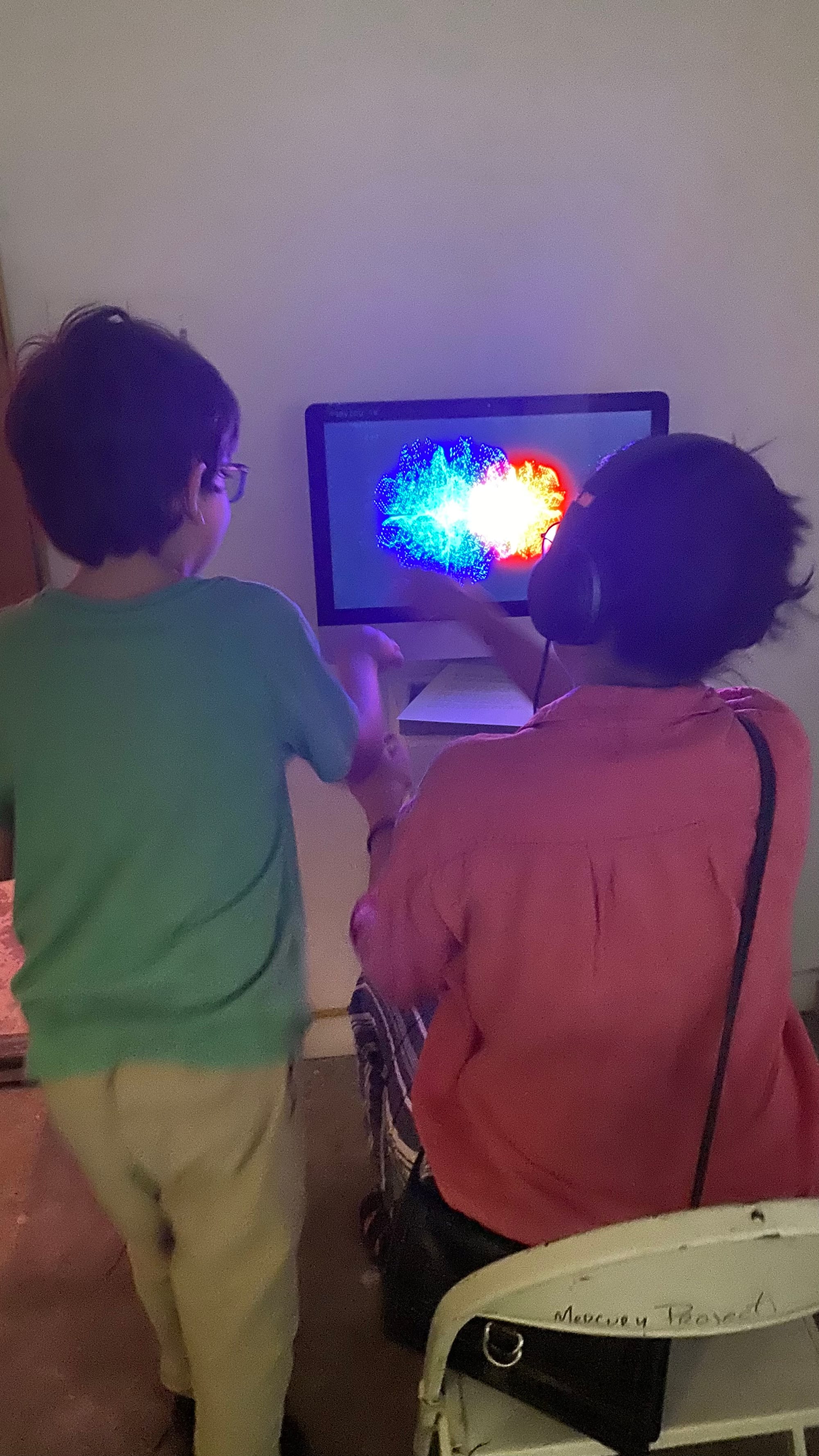 Two stations; each stations contains an iMac, digital stethoscope, headphones, score, and custom audio reactive software program built with MAX MSP