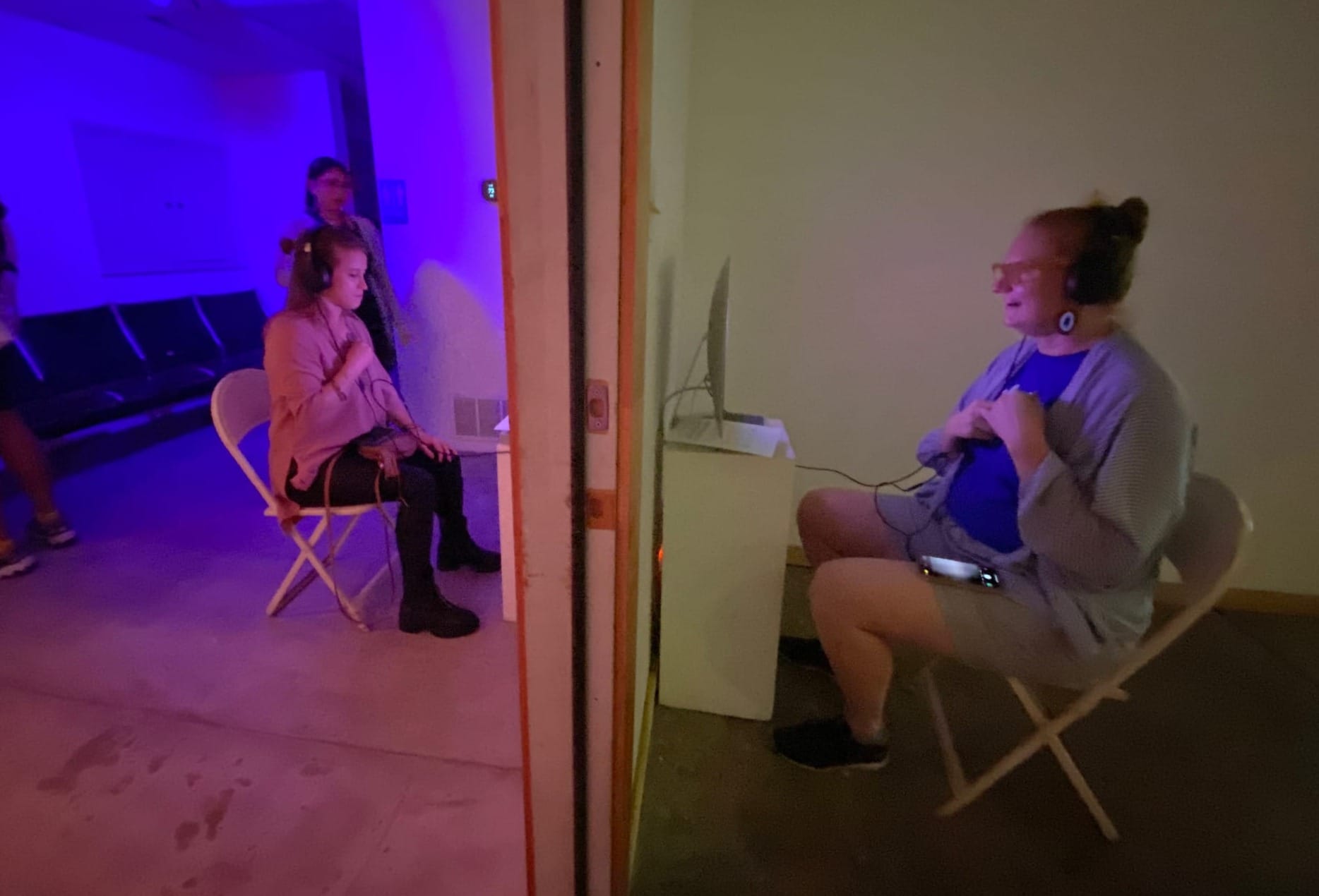 Each person, seated at a station and unable to see the other, puts on headphones, places the stethoscope on their chest, and engages in a self-guided breathing practice. On their screen, they see a visual representation of their heartbeat on the left and the other participant’s heartbeat on the right. Both heartbeats are audible through the headphones, forming a live exchange of physiological data. This communication is rendered both as sound and image, fostering an intimate connection between the two participants.