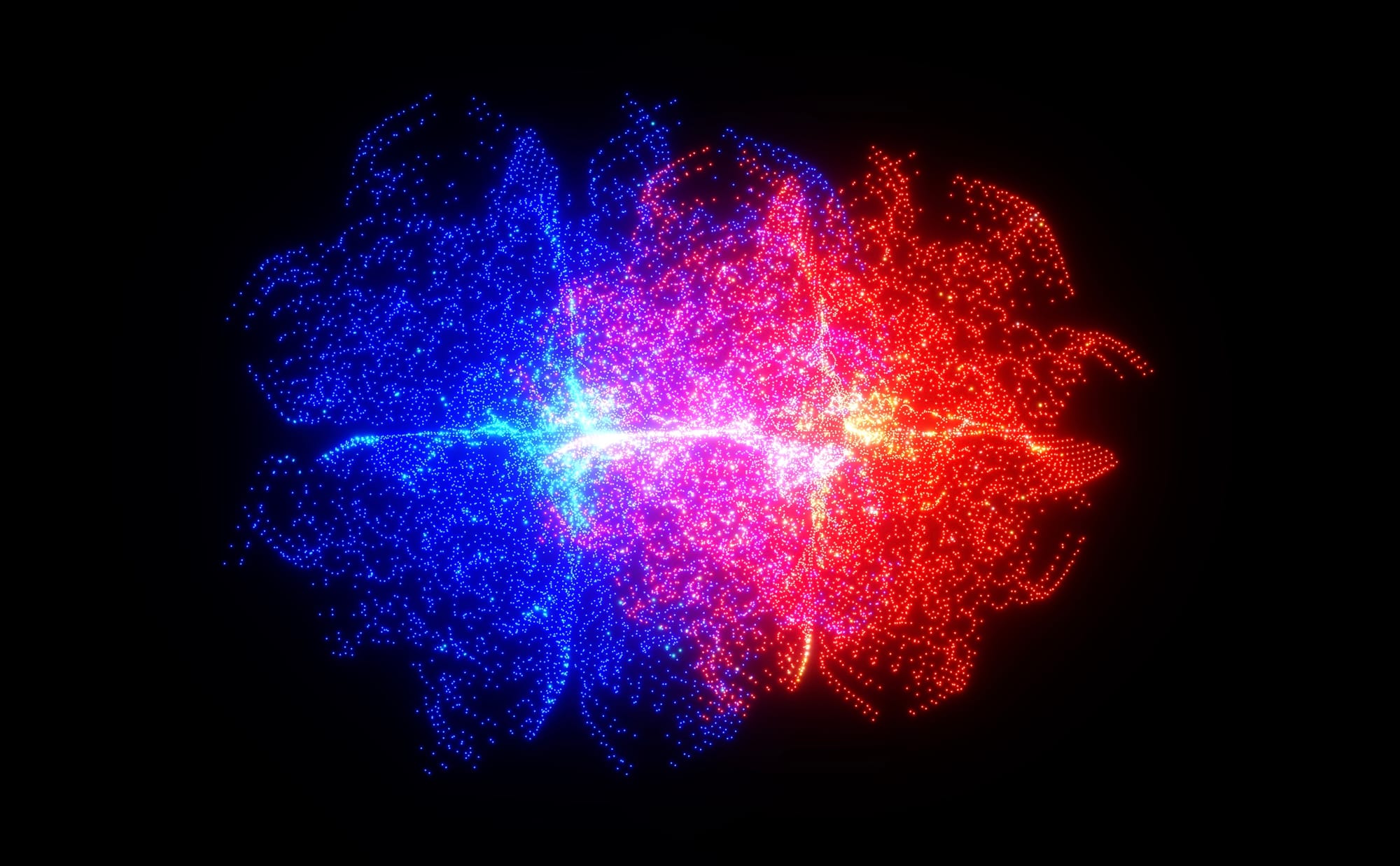 The visuals on each screen consist of red and blue dot patterns, pulsing waves in an abstract flower-like shape whose lines expand and flicker in response to the heartbeats, creating a dynamic and responsive visual display. The process is sensitive to each participant’s physiological input, encouraging them to find stillness and observe the subtle rhythms of the other person. Listening to another person’s heartbeat creates an intimate and shared experience. The installation adapts to the unique physiological inputs of each participant, making each interaction ephemeral and dynamic.