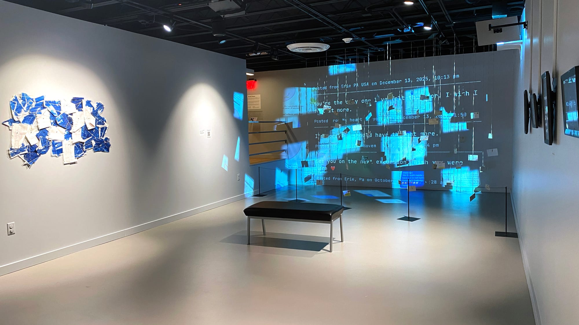 My exploration of communication shaped by technology takes form in Waiting for Your Response, an immersive installation that gathers attempts to connect spanning more than a century. At the heart of the installation are return-to-sender letters from around the world, echoed by answering machine messages, text fragments, and online posts. The projected scrolling text displays messages contributed by viewers addressing people they wish they could reach. These communications accumulate without resolution, revealing both the persistent desire to connect and the frequent failures of such attempts.